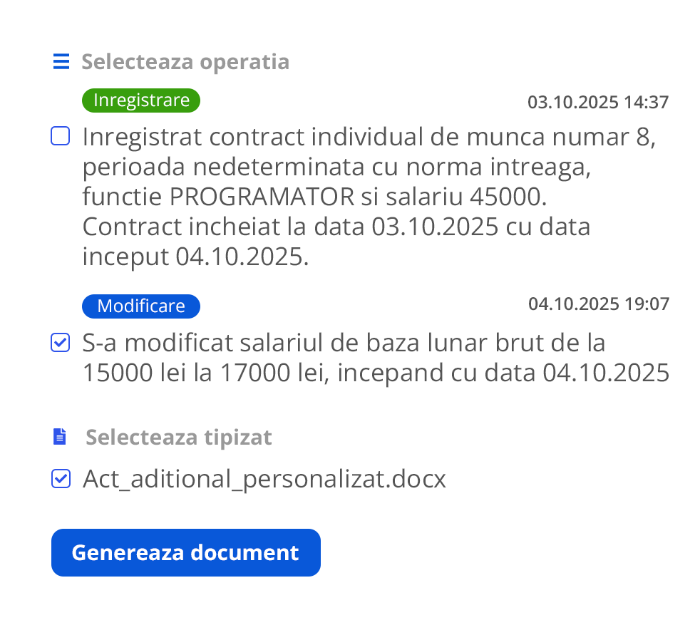 RegesPlus iti permite sa generezi rapid documente HR direct din datele existente in aplicatie. Documentele sunt create in format DOCX, pot fi personalizate si generate in masa, fara a reintroduce aceleasi informatii de fiecare data.