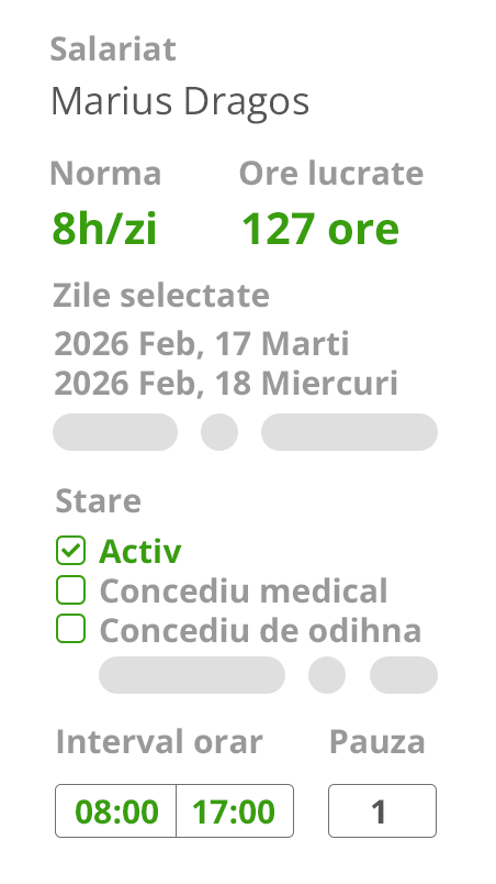 - Pontaj detaliat, cu ora de inceput si ora de sfarsit